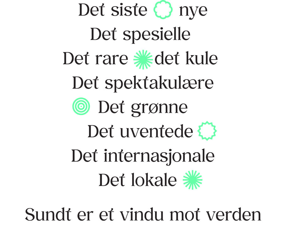 Nye Sundt åpner Q1 2025. Med flere serveringssteder, en spennende miks innen handel, og en internasjonal kontorleietaker skal Sundt gi besøkende opplevelsen av å tre ut av hverdagen og la seg inspirere. Sundt skal igjen ta plass i bybildet, og i folks hjerter. Her vil det være mye aktivitet, travle dager og mange besøkende. Sundt skal være et inspirerende miljø, et vindu mot historien, mot verden og mot en ny tid.
